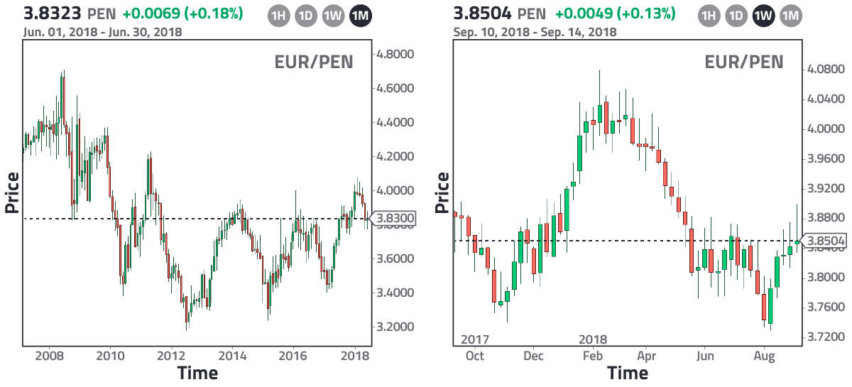 In Fig. 1 we see the EUR/PEN exchange rate from 2008 to 2018 (left) and from October 2017 to August 2018 (right). Both charts are plotted considering one-month and one-week Japanese candlesticks, respectively. To understand the concept of Japanese candlesticks, I invite you to read the following article: "Japanese candlesticks. A complete explanation for beginners." Let's focus first on the left image. The maximum value of the euro was 4.5146 soles and it happened in 2008. On that date, having 1 euro in your pocket was equivalent to having 4.5146 soles. This value could be considered the upper bound of the euro; however, from a statistical point of view, it is better to set the upper bound as the average of all the local maxima over the last 10 years. This gives us an approximate value of 3.9 soles; therefore, this value will be the actual upper bound. Similarly, the lower bound is given by the average of all the local minima, thus we obtain a value of 3.5 soles. What do these values mean? It means that, on average, the euro has oscillated between 3.5 and 3.9 soles within the last 10 years, but how can we make a profit with this information? To understand it, now let's focus on the left image and let's assume that we are in January 2018. As you can see, in that month the euro has crossed our upper bound of 3.9 soles; therefore, it is feasible to assume that it will not grow much more, or in other words, it will soon be devalued. What do we do? We sell euros! Let's say that we have 1,000 euros in our pocket, then we sell them and receive 3,900 soles in return. What do we do next? We wait for the exchange rate to approach the lower bound. In August 2018 we can see that the EUR/PEN exchange rate has decreased to 3.74. Our lower bound is at 3.5, so we can wait or just buy euros in August for fast gains. In this case, because we see a recovery to 3.8 in the following days, we opt for the latter. We buy 1,000 euros and for that, we pay 3,800 soles, 100 soles less than what we received in January. At the end of August in our pockets, we will have the initial 1,000 euros plus 100 soles in profits that appeared out of thin air.