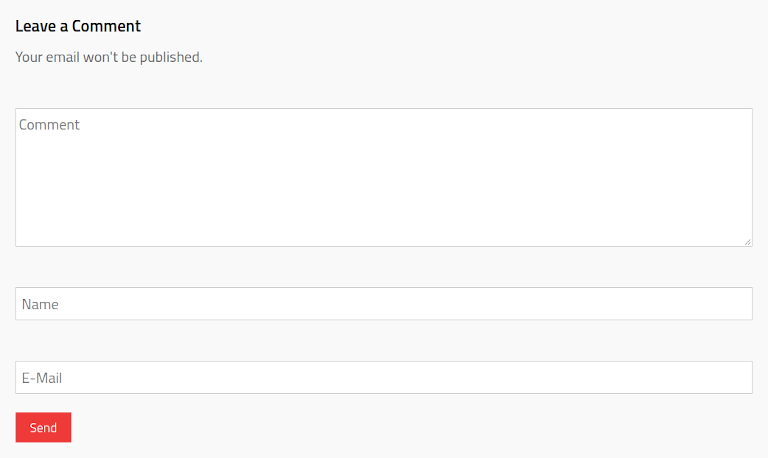 //Variables$comment_send = 'Send';$comment_reply = '<h3>Leave a comment</h3>';$comment_reply_to = '<h3>Reply</h3>';$comment_author = 'Name';$comment_email = 'E-mail';$comment_body = 'Comment';$comment_url = 'Website';$comment_cookies_1 = '';$comment_cookies_2 = '';$comment_before = "<p>Your email won't be published.</p>";$comment_cancel = '<span style="font-size:16px">Cancel Answer</span>';//Arrays$comments_args = array(//Fields'fields' => array(//Author'author' => '<p class="comment-form-author"><br /><input type="text" id="author" name="author" aria-required="true" placeholder="' . $comment_author .'"></input></p>','email' => '<p><br /><input type="email" id="email" name="email" placeholder="' . $comment_email .'"></input></p>',//URL'url' => '<p></p>',//Cookies'cookies' => '<p></p>',),//Send Button Label'label_submit' => __( $comment_send ),//Reply Title'title_reply' => __( $comment_reply ),//Reply To Title'title_reply_to' => __( $comment_reply_to ),//Cancel Reply Text'cancel_reply_link' => __( $comment_cancel ),//Textarea'comment_field' => '<p class="comment-form-comment"><br /><textarea id="comment" name="comment" aria-required="true" placeholder="' . $comment_body .'"></textarea></p>',//Message Before Comment'comment_notes_before' => __( $comment_before),//Remove "Text or HTML to be displayed after the set of comment fields"'comment_notes_after' => '',//Submit Button ID'id_submit' => __( 'comment-submit' ),);//Commentcomment_form( $comments_args );