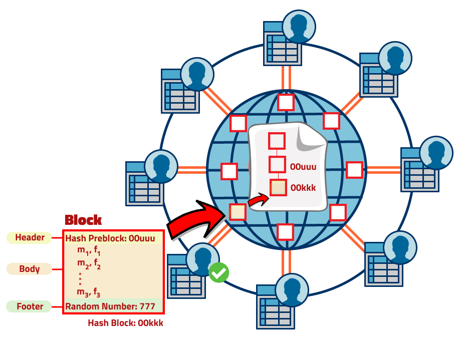 We already know that Bob cannot alter the past of the public account because it is protected by the hashes. Now he will try to alter the future. For this, he will become a miner in order to win the game. He will collect (m, f) pairs and set his block; however, he will include a false transaction in it. He will proceed to obtain the hash and become the winning block, if he succeeds, in theory, his block would be written on the public account. Unfortunately for him, this will not be possible even if he solves the hash first, because the other players will have to validate his block, that is, verify the transactions in it using the special boolean function "v" that we described in the previous section. Moreover, every other player will check that the hash obtained is correct. In this particular example, the other players will certainly find out that Bob has made a mistake and therefore he won't be accepted as the winner of the game. As you can see, this is a consensus, it is not enough to be the first solving the hash, but it is also essential to obtain the validation of the other players, and the others will always seek to act correctly because there is a reward behind.