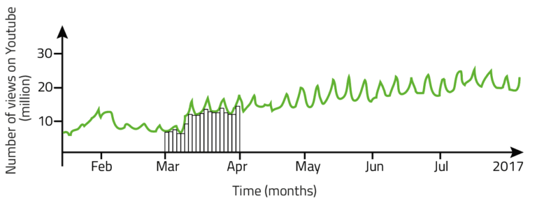 Since it appeared in January 2017, Despacito started to grow at a rate of 6 million views per day, then it went up to 16 million in the month of May and reached 21 million per day in the month of July. What will happen in the next few months? We forecast that by January 2018, Despacito will decline its rate to 3 million views per day because it has been the stable value of many iconic songs. Here are some examples: