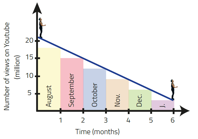 He would have shown that in 6 months (from August 2017 to January 2018) Despacito would fall linearly from 21 million to 3 million views per day (see blue line in Fig. 1), reaching a stable and constant value from then on. Why would he have done that? Because a linear trend is the simplest way to start a predictive analysis. However, even when drawing a line, calculating the date when it reaches 4 billion views seems to be a complex task.
