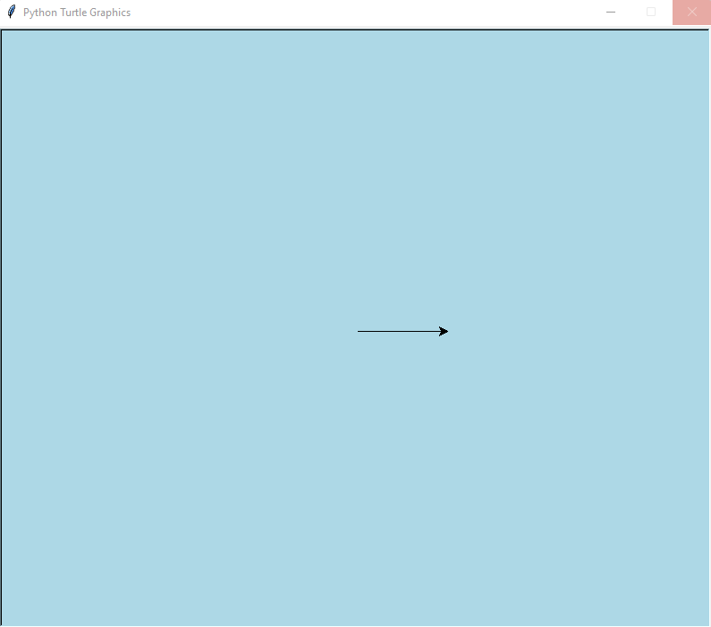As you can see from the figure above, in Python turtle is the cursor shown in the middle of the screen. Its position is x = 0 and y = 0. Notice that the turtle is pointing to the right, meaning if we want it to move forward in the same direction, we need to write the function forward(). It is also possible to change the screen background color.