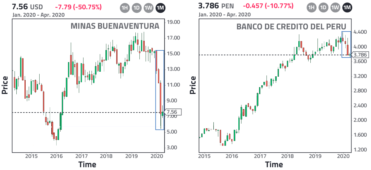 In Fig. 4 we have the price chart, within the last 5 years, of two companies listed on the Lima Stock Exchange. Each Japanese candle is equivalent to a month in duration. As you can see, the company focused on raw materials, i.e., Minas Buenaventura, collapsed in the first four months of 2020 (see blue box), suffering a loss of over 50%, while the company focused on taking care of your money, i.e., Banco de Credito del Peru, only suffered a loss of ~11% (see blue box). This shows that raw materials in emerging countries are drastically affected during a global crisis.