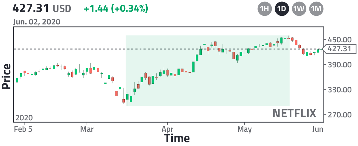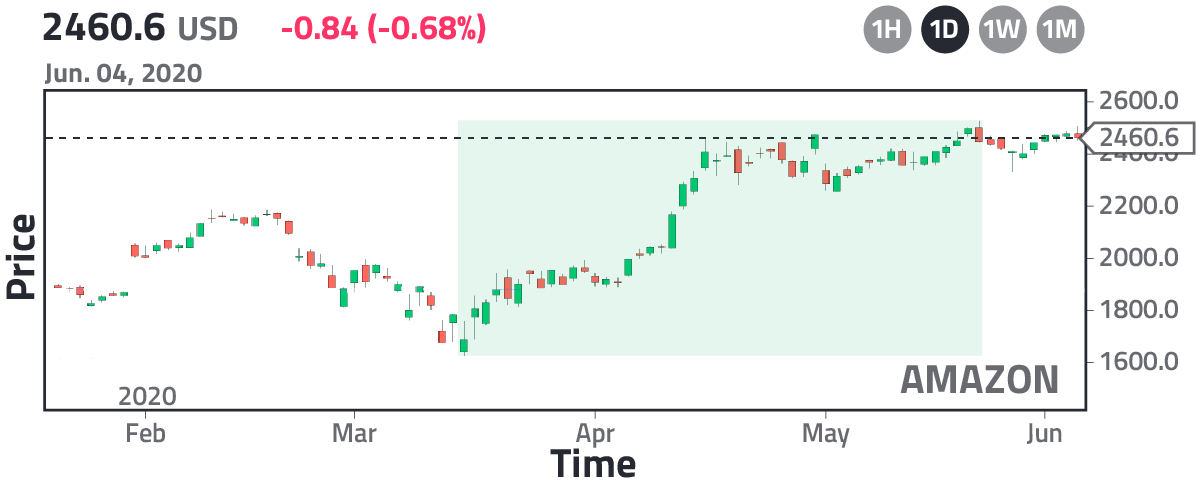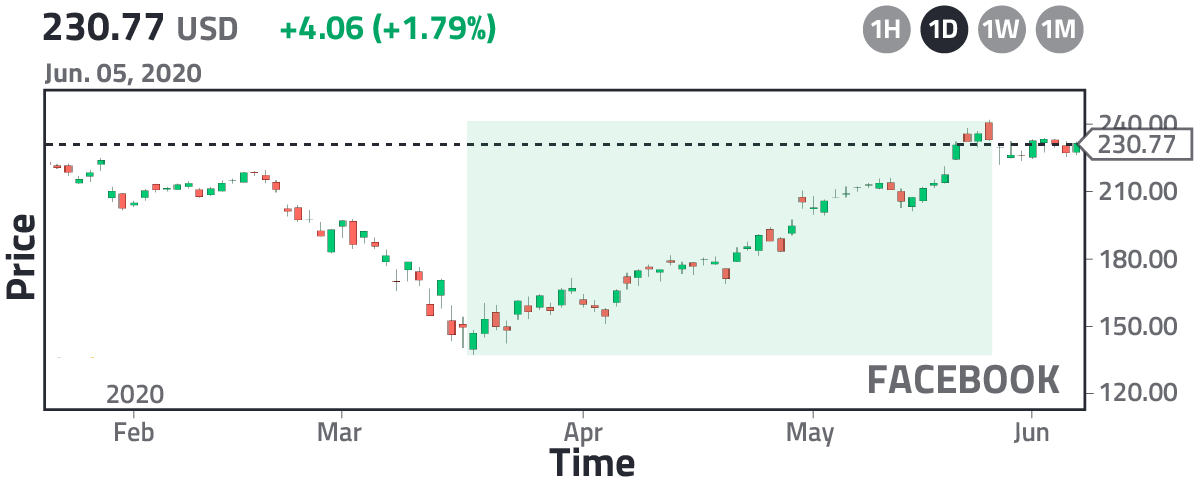 In the stock market, making money is easy if you play it safe, and the safest thing to do will be to bet on the most powerful companies, that is, companies with the largest market capitalization. They lead the world market, and therefore, if the world is in a crisis, these companies will be the first ones to rise again. But that's not all. In a time of crisis, it is always important to pay attention to the details. By the end of February 2020, the World Health Organization had declared that COVID-19 was a global pandemic. Because of this, governments closed their borders, and world markets burst, fearing a possible recession. Details about the crisis are given in the article, "How to exchange currencies during a global crisis." As you may remember, during this period, governments imposed a quarantine, i.e., it was forbidden to leave home, and it is here that you, as an investor, would have asked yourself the following question: "What companies would benefit from a quarantine?" You already know that the most powerful companies will be the first ones to rise again, but there are many powerful companies, so out of all of them, which ones will recover first? With simple reasoning, you could easily conclude that if quarantine is imposed, then people will seek to entertain themselves at home, and the most practical way to do it is by considering the internet and TV, that is, companies related to this type of entertainment should be the first ones to recover, and who is the biggest player in this sector? Netflix! That's why it reached a record high during the COVID crisis. But that's not all; if it is forbidden to leave the house, then how would you buy stuff that you usually buy in a mall? The answer is quite obvious: use e-commerce services, and the giant in this sector is Amazon. That's why it reached a record high. The global demand for Amazon grew dramatically, to the point that Amazon had to hire more people. Finally, we are aware that humans are social beings, and they cannot survive without being in contact with their friends. If they are at home, then eventually they will choose a social network to interact and the biggest player that we know is Facebook. In the following image, I show you the fluctuation of Netflix, Amazon, and Facebook in the stock market for the period February–May 2020.