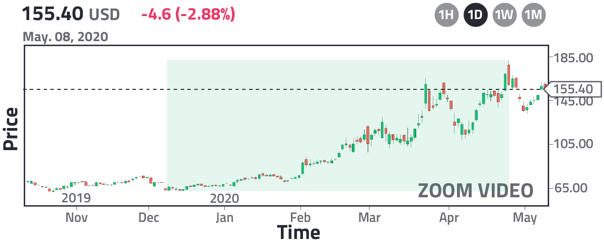 In position number 5 we have a company, whose service you have likely used. In the previous case, we paid attention to what an individual does when is in isolation, for instance, he or she would look for entertainment and social interaction, but besides that, an individual who stays at home also needs to work or study, but how could this be done without leaving the house? The answer relies on the videoconference. This service exploded worldwide because universities, institutes, colleges, companies, and organizations were forced to use it. Some of them opted for Skype or Teams, which belongs to Microsoft, and others chose Whatsapp, Messenger, or Workplace, which belongs to Facebook, but this crisis showed us that the more focused a company is on something, the more attractive it becomes, and that's why, although Teams, for example, had a lot of users, Microsoft did not grow dramatically on the stock market. In contrast, Zoom Video Communications, being a company dedicated 100% to the field of videoconference, captured worldwide attention. In the following image, you can see its dramatic growth in the stock market from the end of 2019 to May 2020: