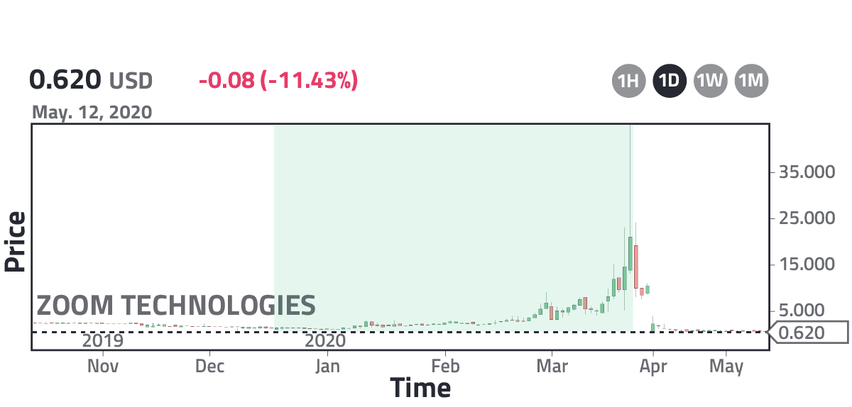 As shown in Table V, Zoom Technologies grew 5890% in 3 months, then crashed from 59.9 USD to values below 1.0 USD. The reason for this is that many investors throughout the world chose to buy Zoom Technologies shares after learning about a software called Zoom that was becoming widely used. For these investors, if the software was called Zoom, then it was obvious that the company creating it was Zoom Technologies. Once these investors realized that they had made a very serious mistake, they sold their shares causing Zoom Technologies' value to plummet in just four days, see Fig. 3. This psychological phenomenon is common in the stock market and has occurred throughout history because every investor wants to be the first one buying something; as a result, some do not pay attention to details and act fast without thinking. For example, during the dotcom era (when the internet exploded around the world), many companies that had nothing to do with the internet saw their shares skyrocket simply because their names were very similar to internet companies, implying that many investors made very serious mistakes, but as I previously stated, this happens all the time and serves as a lesson for the future, e.g., if you had foreseen that some investors would make such a mistake, you would have purchased Zoom Technologies shares when they were barely worth 1.0 USD. With this, a 10,000 USD investment would have given you 590,000 USD.