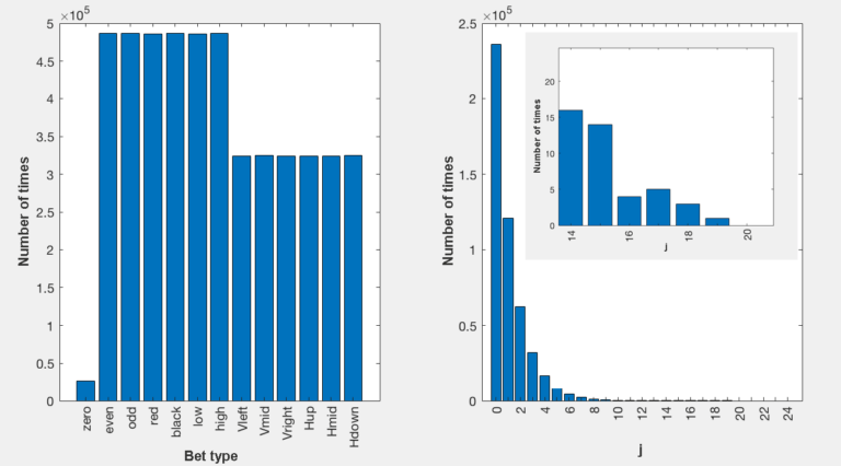 In Fig. 2 (left) we show a histogram of how many times each type of number has come out, more details appear in rouletteMartingale.m. As you can see, what we said in the previous section is true, that in a million games all numbers must come out in the same proportion, that is, we have practically the same amount of reds and blacks, of evens and odds, of highs and lows, etc. In Fig. 2 (right) we are showing the Martingale bet. As you can see, in a million games it is feasible to obtain, at least once, j = 19, that is, it is feasible that the color red does not appear in 19 consecutive games, something that seems illogical, but statistically speaking it is a real phenomenon. Keep in mind that this result is for a million games that I played, possibly if you run the program, you may get a higher j, because certainly the probability of getting j beyond 19 will never be zero. In general we have: