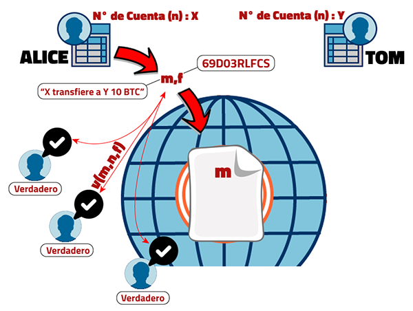 Esta posiblemente sea la ventaja más importante y significa que cualquiera podrá verificar que la transferencia solo fue hecha por Alice, aún desconociendo su identidad. Suena paradójico pero es solo matemáticas. Para entenderlo debes considerar que todo usuario tiene un número de cuenta y una contraseña. Ambas están relacionadas matemáticamente, esta relación se denomina "encriptación de la clave pública" o "encriptación asimétrica"; no obstante, deducir la relación algebráicamente es prácticamente imposible. El número de cuenta es una clave pública, todos la pueden ver, mientras que la contraseña es privada. Justamente la contraseña te autentifica como el dueño de la cuenta y te va permitir acceder a ella, por tanto más te vale no compartirla con nadie. Al definir una transferencia se genera la firma digital que depende de la contraseña (c) y del mensaje dado (m), es decir, f(m,c). Para efectos prácticos estamos obviando "#". Como puedes ver, si no tienes la contraseña, no vas a dar con la firma correcta. Tal como apreciamos en la Fig. 4, es el par (m, f) que se envía a la cuenta comunitaria pero "m" no se escribe en ella hasta que "f" no sea validada. Para validarla se usa una función booleana especial (v) que depende del número de cuenta (n), del mensaje dado (m), y de la firma digital (f), es decir, v(m,n,f). Curiosamente, la función "v" es verdadera solo si se usó la contraseña correcta. Y es falsa si alguien intentó suplantarla. Intuitivamente podrías pensar que tiene sentido porque si "v" depende de "f" y "f" depende de "c", entonces "v" estará asociada matemáticamente a "c", la contraseña correcta; esto implica que si alguien la altera (o desconoce la contraseña), la función "v" cambiará y por tanto obtendremos falso como respuesta.
