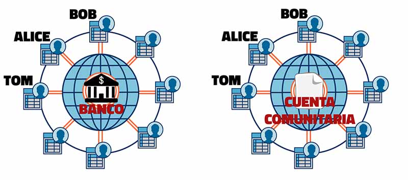 En la Fig. 3 te muestro las diferencias de usar un banco o una cuenta comunitaria. A simple vista se ven exactamente igual, pero no te dejes engañar. En el caso del banco (izquierda) se usan dólares y las transferencias hechas por Alice, Bob y Tom están enteramente controladas por el banco, mientras que en el caso de la cuenta comunitaria (derecha) se usan bitcoins (BTC) y todos tienen el control, es decir, todos tienen acceso a los datos, pero es aquí que surge el problema, ¿podemos confiar en los demás?