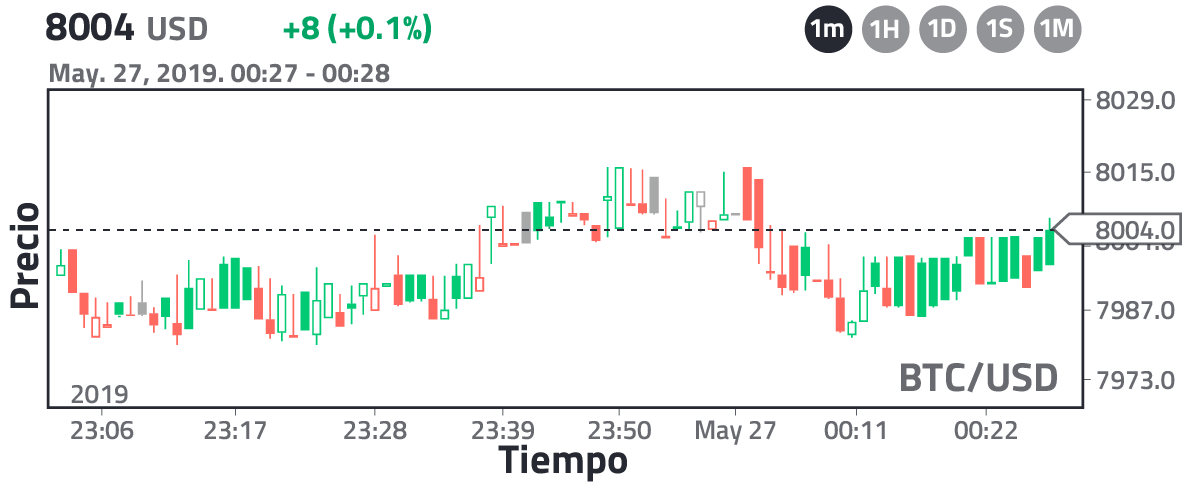 La Fig. 7 nos muestra cómo era la gráfica de Bitstamp en los tiempos donde usaba velas de seis colores. A modo de ejemplo, estamos considerando la fluctuación por minuto del precio de los bitcoins respecto al dólar, es decir, en este caso cada vela equivale a un minuto de tiempo.