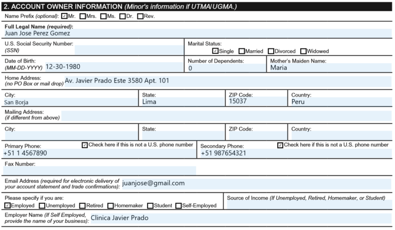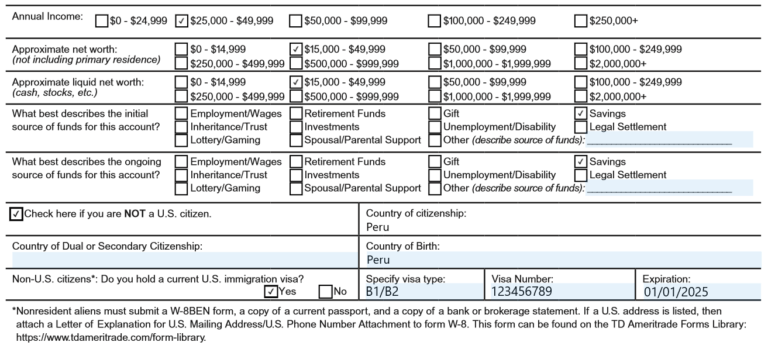 Con esto habrás llenado correctamente el formulario de aplicación. Para obtener información sobre cómo llenar el otro formulario, haz click en "W-8 BEN", caso contrario, para regresar a los 6 pasos para activar tu cuenta en TD Ameritrade, haz click en "Principal".