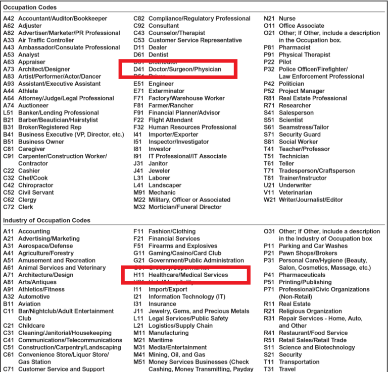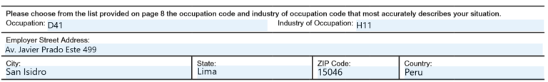 Como puedes observar en la Fig. 2, en el rubro de la ocupación escribí D41 y en el rubro de la industria escribí H11. Estos códigos aparecen detallados en la última página de la aplicación: