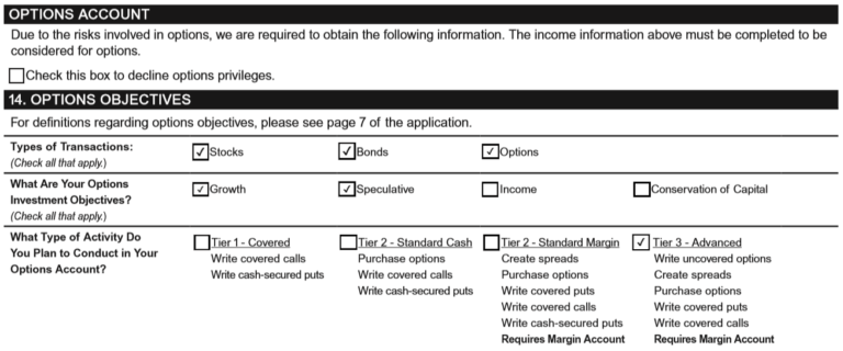 Esto te dará acceso a las "opciones", las cuales pertenecen a un método de inversión de alto riesgo. Posiblemente nunca las llegues a utilizar pero tener activado las opciones será de gran utilidad a futuro si tus conocimientos en la bolsa de valores aumentan progresivamente. Ten presente que no cuesta nada tener activado las opciones, es gratuito. No obstante, si quieres desactivarlas, haz click en el recuadro superior de la Fig. 6, donde dice "check this box to decline options privileges", y en el punto 14 déjalo todo en blanco.