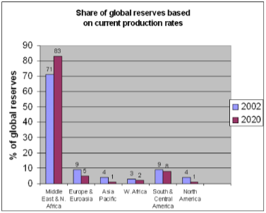 Como se ve en la Fig. 2.3.1.1, los países con una gran cantidad de reservas de petróleo son los países de Medio Oriente, siendo los únicos capaces de aumentar sus reservas de petróleo. Por lo tanto, si la producción de petróleo continúa al ritmo actual, muchos de los mayores productores de 2002 pronto dejarán de desempeñar un papel relevante en el mercado petrolero.