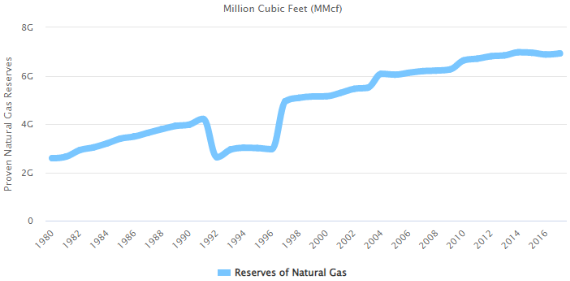 Según la perspectiva anual de la energía 2019 de la Administración de Información Energética de Estados Unidos, se estimaron más de 2 mil billones de pies cúbicos de recursos técnicamente recuperables de gas natural seco en los EE. UU. (Millennium Alliance for Humanity & the Biosphere MAHB, 2019).