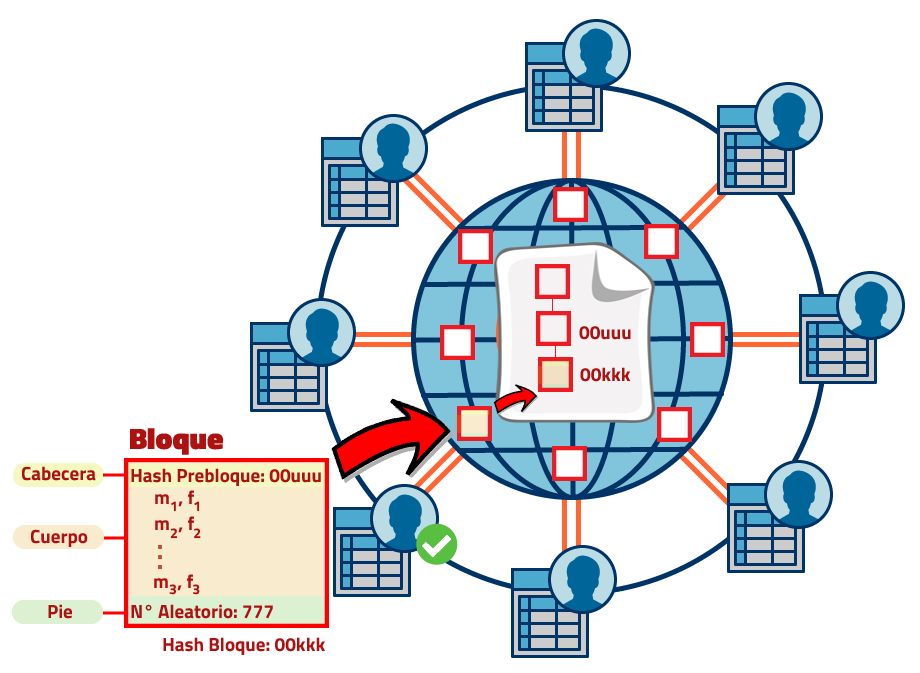 Tal como aprecias en la Fig. 5, el recuadro rojo representa un bloque y está formado por tres partes: una cabecera, un cuerpo y un pie de página, en la cabecera está el hash del bloque anterior, en el cuerpo están todas las transacciones recolectadas, y en el pie de página el jugador podrá escribir un número aleatorio que desee. Lo que tiene que hacer el jugador para ganar es definir el hash de su bloque pero bajo una condición: "Este nuevo hash debe empezar con una cantidad definida de ceros". Y para lograrlo justamente usa el pie de página porque es ahí que podrá aleatoriamente generar un número que cumpla esta regla. Curiosamente conseguirlo es muy difícil, tanto como si te dijesen que debes lanzar 10 dados juntos y obtener como mínimo en 5 de ellos el valor 1 para ganar. Para lograrlo vas a tener que repetir la experiencia innumerables veces hasta acertar, demanda mucho esfuerzo y al mismo tiempo hay suerte. Como dije, gana quien genera el hash, pero sobre todo, quien obtiene la validación de los demás. ¿Y qué es lo que gana? Ya dijimos al inicio que se ganan recompensas y en el caso de este juego son los bitcoins, el sistema te los regala al transcribir tu bloque a la cuenta comunitaria y como puedes apreciar en la Fig. 5, esta cuenta comunitaria alberga muchos bloques ganadores, en secuencia, enlazados por el hash en sus respectivas cabeceras y es por eso que la llaman la cadena de bloques o blockchain en inglés.