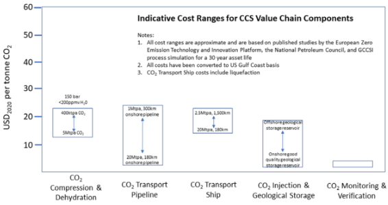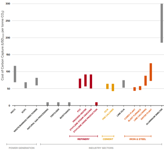 La Fig. 4.2.2 muestra los costos de captura de carbono en varios procesos industriales y de energía, excluyendo la compresión de CO2. Además, la Fig. 4.2.3 ilustra los costos indicativos solo para cada parte de la cadena de valor suponiendo que se construya en la costa del Golfo de EE. UU.