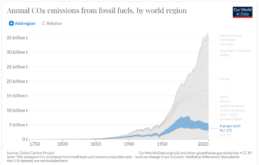 Como se ve en la Fig. 4.1.3, hasta el siglo XX, Europa y los EE. UU. fueron las regiones emisoras más grandes del total de emisiones globales de CO2, emitiendo más del 85% de las emisiones globales en 1950. Sin embargo, esto ha cambiado con el tiempo. A partir de la segunda mitad del siglo XX, se puede apreciar que las emisiones de CO2 en particular han aumentado significativamente en el resto del mundo, especialmente en Asia, y de manera más notoria en China.