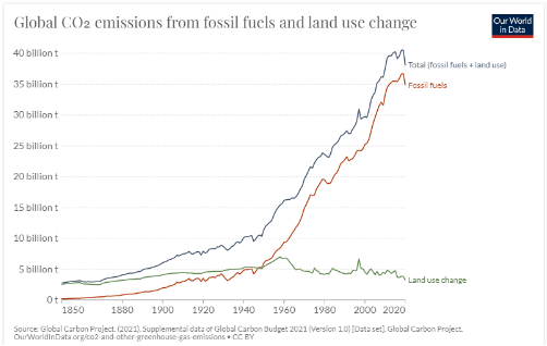 La mayoría de estas emisiones de CO2 que el mundo emite anualmente provienen de combustibles fósiles. La Fig. 4.1.2 muestra las emisiones globales de CO2 de los combustibles fósiles y el cambio de uso de la tierra desde mediados del siglo XIX hasta la actualidad.