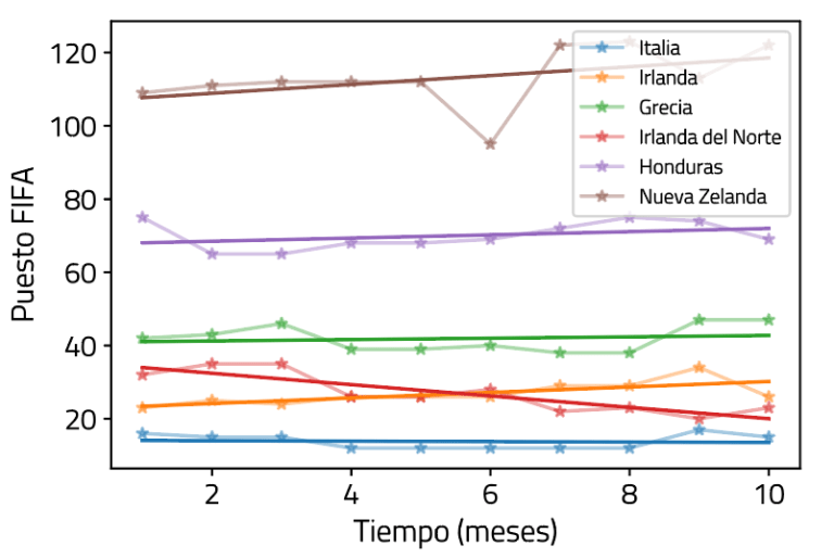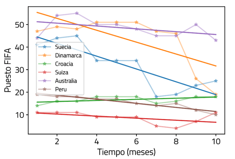 A continuación graficamos los datos dados en la Tabla V. Estos datos los ajustamos a una recta haciendo uso del método de los mínimos cuadrados. Para profundizar en el tema te recomiendo leer el tutorial: "El método de los mínimos cuadrados con Despacito". Este ajuste lineal es lo que llamamos una tendencia lineal porque los datos dados los estamos aproximando a una recta para así fácilmente deducir si con el tiempo los equipos mejoraron en puesto o no. Las rectas con pendiente negativa son aquellas que indican una mejora en el ranking. Estos cálculos fueron desarrollados en Python, el código lo puedes descargar de mi repositorio de Github.