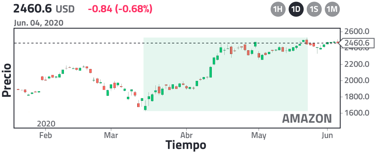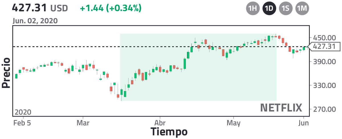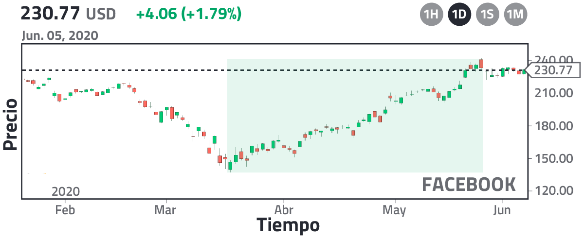 En la bolsa de valores hacer dinero es fácil si apuestas a lo seguro y lo más seguro siempre será apostar por las empresas más poderosas, es decir, las empresas que mueven más capital en el mundo. Ellas direccionan el mercado mundial y si el mundo empieza a caer, serán las primeras en levantarse. Pero no solo eso, en un período de crisis siempre es importante analizar los detalles. Fue a finales de febrero 2020 que la Organización Mundial de la Salud declaró que el COVID-19 ya era una pandemia mundial. Debido a esto, los gobiernos cerraron sus fronteras y los mercados del mundo colapsaron por miedo a una eventual recesión. Los detalles aparecen registrados en el artículo: "Cómo cambiar monedas en tiempos de crisis mundial". Como bien recordarás, muchos gobiernos aplicaron la cuarentena, es decir, quedó prohibido salir de casa y es aquí que tú, como inversor, te hubieses hecho la siguiente pregunta: "¿Qué empresas podrían beneficiarse con esto?". Ya sabes que las más poderosas serán las primeras en recuperarse, pero hay muchas que son muy poderosas, ¿cuál de todas se recuperará primero? Con un sencillo razonamiento podrías fácilmente concluir que si cierran las fronteras del mundo y todos se quedan en casa, entonces buscarán alguna forma de entrenerse sin salir de ella y el camino más práctico está en la televisión y el internet, es decir, empresas en estos rubros deben recuperarse prontamente, tal fue el caso de Netflix que acumuló una mayor cantidad de usuarios con esta crisis y logró así alcanzar máximos históricos en la bolsa de valores. Adicionalmente, si está prohibido salir de casa, entonces ¿cómo harías las compras que usualmente haces en un centro comercial? La respuesta es casi inmediata, usando los servicios del e-commerce y el gigante por excelencia en este rubro es Amazon. Justamente, fue así que Amazon logró un récord histórico en la bolsa de valores porque surgió la demanda mundial de su servicio al punto que tuvieron que contratar mayor personal. Finalmente, hubieses intuido que el ser humano es un ser social y si está encerrado en casa, tarde o temprano buscará estar en contacto con la sociedad y el camino más cercano será usando una red social, siendo Facebook el más popular. A continuación, en la siguiente imagen, detallo la fluctuación de estas tres empresas, i.e., Netflix, Facebook y Amazon, en la bolsa de valores para los meses que van desde febrero hasta mayo 2020.