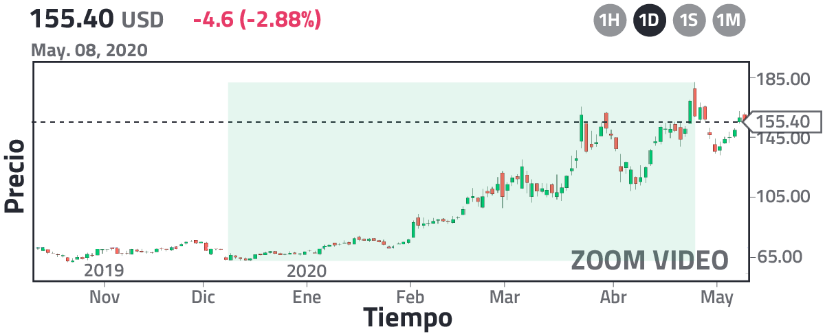 En el puesto número 5 tenemos una empresa cuyo servicio es muy probable que tú llegaste a usar. En el caso anterior nos enfocamos en analizar el entretenimiento, las compras y la interacción social, pero un individuo que se quede en casa también necesita trabajar o estudiar, ¿y cómo puede hacerlo sin salir de ella? La respuesta está en la videoconferencia. Este servicio explotó a nivel mundial, pues muchas universidades, institutos, colegios, empresas y organizaciones se vieron obligadas a usarlo. Algunas empresas optaron por Skype o Teams, las cuales pertenecen a Microsoft, otras eligieron Whatsapp, Messenger o Workplace, las cuales pertenecen a Facebook, pero esta crisis nos mostró que cuanto más enfocada esté una empresa en algo, se convertirá en la más atractiva para invertir, es por eso que aún cuando muchos usaron Teams, Microsoft no creció dramáticamente en la bolsa de valores. En contraste, Zoom Video Communications al ser una empresa dedicada al 100% al rubro de las videoconferencias capturó la atención mundial. En la siguiente imagen puedes ver su gran crecimiento en la bolsa de valores desde fines del 2019 hasta mayo del 2020: