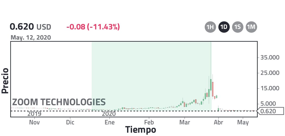 Como se aprecia en la Tabla V, Zoom Technologies creció 5890% en 3 meses, luego se desplomó de 59.9 USD a valores inferiores a 1.0 USD. Esto se debió a que muchos inversores optaron por comprar acciones de Zoom Technologies al enterarse que existía un software llamado Zoom que estaba haciéndose muy popular. Para estos inversores, si el software era llamado Zoom, entonces era obvio que la empresa que la estaba creando era Zoom Technologies; no obstante, cuando estos inversores se dieron cuenta que habían cometido un gravísimo error, vendieron todas sus acciones y por eso el valor de Zoom Technologies se desplomó en apenas 4 días, ver Fig. 3. Este fenómeno psicológico es común verlo en la bolsa de valores, se viene repitiendo constantemente a lo largo del tiempo pues todo inversor desea ser el primero en comprar la acción; debido a ello, algunos no prestan atención a los detalles y actúan rápido sin pensar. Por ejemplo, fue en la era dotcom (cuando el internet explotó en el mundo), que muchas empresas que no tenían nada que ver con el internet vieron sus acciones crecer dramáticamente únicamente porque sus nombres era similares a empresas de internet, es decir, muchos inversores cometieron gravísimos errores, pero como dije, esto siempre ocurre y por tanto es una lección para llevarnos a futuro, e.g., si hubiésemos previsto esto, hubiésemos comprado acciones de Zoom Technologies cuando apenas valían 1.0 USD. Con ello, una inversión de 10 000 USD te estaría otorgando 590 000 USD.