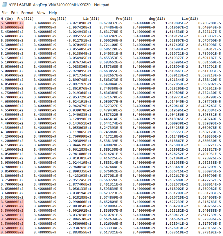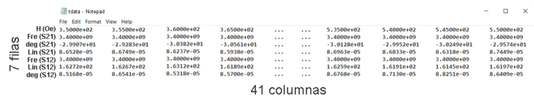 Todos los archivos de texto tienen el mismo formato. En la primera fila están los nombres: H (Oe), Fre(S21), deg(S21), Lin(S21), Fre(S12), deg(S12), Lin(S12), y en las subsiguientes los valores numéricos. Como puedes ver en la Fig. 1, la primera columna tiene datos repetidos, estos aparecen resaltados en color rojo. Como primer paso, lo que vamos a hacer será importar los 37 archivos de texto en Python pero omitiendo los datos repetidos, es decir, al momento de importar cada archivo consideraremos únicamente los datos que van de la línea 2 hasta la línea 42. Claro está, debes tener presente que en Python se empieza a contar a partir del número cero, i.e.,