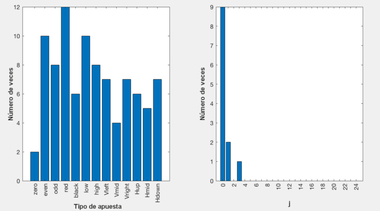 En la Fig. 2(izq.) estamos graficando cuántas veces han salido cada tipo de apuesta, mayores detalles aparecen en el archivo rouletteMartingale.m. Como puedes observar, se cumple lo dicho en la sección anterior, que en un millón de juegos todos los números deben salir en la misma proporción, es decir, saldrán prácticamente la misma cantidad de rojos y negros (red & black), pares e impares (even & odd), altos y bajos (low & high), etc. En la Fig. 2(der.) estamos graficando la apuesta de Martingale. Como puedes apreciar, en un millón de juegos es factible obtener, al menos una vez, j=19, es decir, puede darse el caso que el color rojo no salga en 19 juegos consecutivos, algo que parece ilógico de creer, pero que estadísticamente es un fenómeno real. Ten presente que este resultado es para un millón de juegos que yo ejecuté, posiblemente si tú ejecutas el programa, obtengas un j aún mayor, porque ciertamente la probabilidad de obtener  j más allá de 19 nunca será cero. En términos generales tenemos: