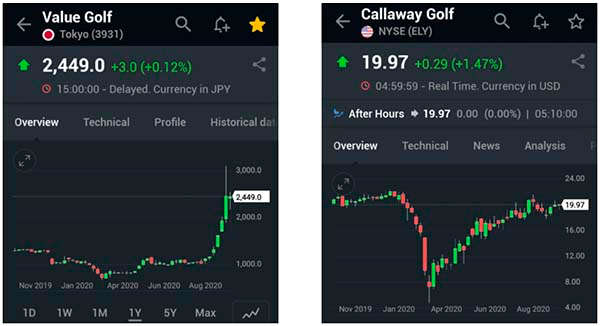 Personalmente considero que la bolsa de valores de un país, más allá de reflejar la economía del mismo, permite capturar sus costumbres. Ciertamente, esto lo descubrí cuando empecé a invertir en distintas bolsas del mundo y entendí que las estrategias de inversión que usaba en Occidente no eran aplicables en Oriente, o aquellas que daba por hecho en el Norte, dejaban de tener validez en el Sur. A modo de ejemplo, consideremos las siguientes gráficas, donde comparamos dos empresas públicas del mismo rubro: Value Golf y Callaway Golf. La primera cotiza en la Bolsa de Valores de Japón y la segunda lo hace en EEUU. Estas gráficas muestran el precio de la acción durante la crisis del COVID-19, en particular, durante el año 2020: