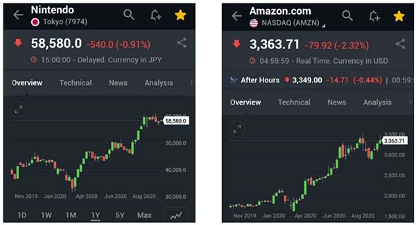 En el año 2020, las acciones de Amazon y Nintendo estaban valorizadas respectivamente en +3 000 USD y +50 000 JPY. Considerando que en promedio 1 USD = 100 JPY, entonces la empresa Nintendo, que cotiza en la Bolsa de Valores de Japón, tenía una acción valorizada en 500 USD aproximadamente.