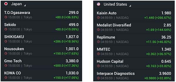 Fig. 4: Listado de las empresas con mayor fluctuación positiva en Japón el 15 de octubre del 2020 (izquierda) y en EEUU el 14 de octubre del 2020 (derecha).