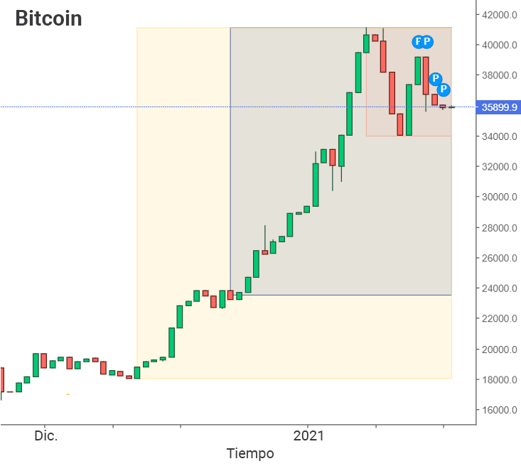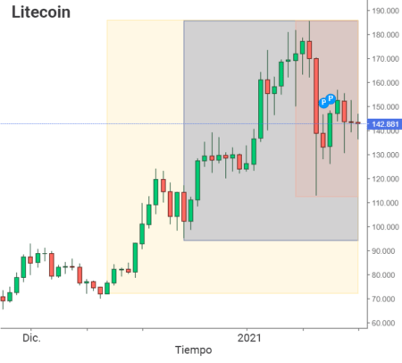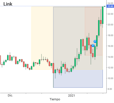 En la Fig. 2 estamos viendo la fluctuación del precio de los bitcoins para los meses de diciembre 2020 y enero 2021. El recuadro amarillo empieza el 12 de diciembre, el recuadro azul el 23 de diciembre y el recuadro rojo el 08 de enero. Estos recuadros representan respectivamente para esas fechas, el inicio, la continuación y el fin del mercado alcista, entonces si decimos que los litecoins se comportan como un aumentador de presión, podemos inferir que en el período alcista, que va desde el 12 de diciembre hasta el 08 de enero, los litecoins están destinados a crecer más que los bitcoins. Similarmente, si decimos que link se comporta como una cobertura, debemos inferir que en el recuadro rojo, link está destinada a crecer para compensar el estancamiento de los bitcoins...