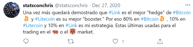 Con respecto a link la historia es distinta. En el universo de las criptomonedas existe una profecía mesiánica que indica que en un futuro surgirá un nuevo bitcoin que nacerá del grupo de los altcoins y cambiará el curso de la historia. Este nuevo bitcoin será tan original que todos buscarán tenerlo y por ende invertirán en él todo su dinero, lo que eventualmente implicaría que el precio de ese bitcoin llegaría a valores colosales. Como no es posible saber cual será, cada temporada surgen candidatos. En el 2017 apareció con fuerza el concepto DeFi (Descentralized Finance en inglés) y con dicho concepto surgieron un grupo de altcoins cuyo propósito se enfocó en descentralizar las finanzas, porque si bien los bitcoins se traducen en almacenamiento y transferencia de dinero digital en forma descentralizada, el mundo financiero es más que eso y también incluye a los contratos, los préstamos, los derivados y muchos más. En caso estés perdido en este tema, en el tercer video asociado al artículo: "El origen de los bitcoins. Explicación completa para principiantes", explico en forma muy sencilla cómo generar un contrato haciendo uso de la cadena de bloques. En este sentido, si lograsemos descentralizar todas las variables del mundo financiero, la vida sería completamente diferente. Por eso, muchos inversores consideran que los altcoins DeFi son los bitcoins del futuro, entonces cada vez que los bitcoins dejan de crecer respecto al dólar, estos inversores optan por migrar sus inversiones a esos altcoins, y por ende se comportan como una cobertura. De todas las criptomonedas DeFi en circulación, link es mi favorita, pero explicarte el porqué implicaría adentrarnos en la parte técnica y es mejor dejar eso para otra oportunidad porque a fin de cuentas el propósito de este artículo era reafirmar mi 90.5% de crediblidad.