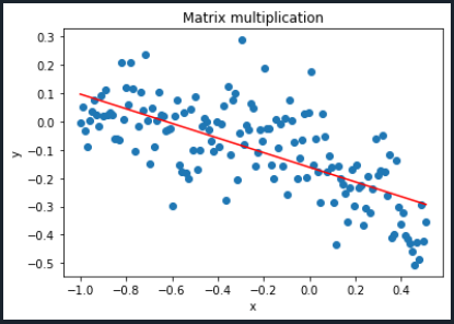 En Python, la inversa de una matriz se escribe usando la función np.linalg.inv(), y para multiplicar matrices es necesario usar la función .dot (), de lo contrario, si escribe el símbolo común para la multiplicación '*', obtendrá un error. Si imprimimos la variable coeff, obtendremos un array compuesto por todos los coeficientes (en este caso solo $c_0$ y $c_1$)