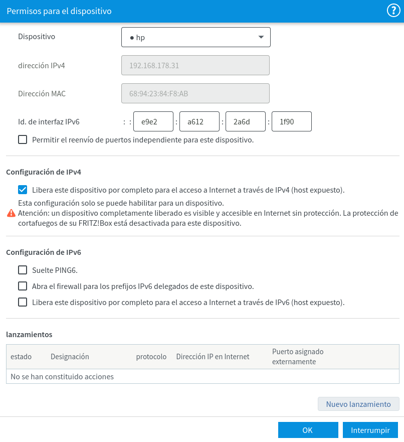 Como podemos apreciar, la dirección IPv4 local del dispositivo hp es 192.168.178.31. En la Fig. 4 hemos elegido liberar el dispositivo vía IPv4. Podemos también usar la opción IPv6 (Internet Protocol version 6 en inglés), pero aquí nos enfocaremos en IPv4 porque es el más usado mundialmente. Habiendo definido el dispositivo, hacemos click en Nuevo lanzamiento para configurar el reenvío de puerto, ver Fig. 5.
