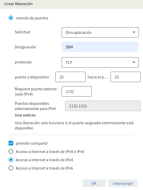 En nuestro caso, los puertos externos disponibles vía IPv4 son 1132 y 1151, Elegimos 1132. Consideramos la conexión SSH, la cual usa el protocolo TCP, y definimos el puerto interno en 22 (El rango del puerto del dispositivo va de 22 hacia 22), el cual viene a ser el valor por defecto en una conexión SSH. En este sentido, cualquier información que llegue por SSH al puerto 1132 del router será reenviado al puerto 22 del dispositivo hp. En tu caso, existe la posibilidad que no necesites configurar el puerto externo porque tu router no presenta esa opción y usa los valores por defecto, i.e., cualquier información que llegue por SSH al puerto 22 del router será reenviado al puerto 22 del dispositivo. Definido esto, hacemos click en OK.