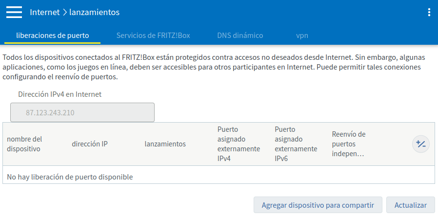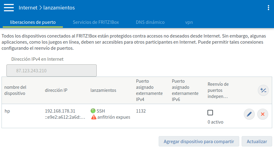 Como puedes apreciar, el IPv4 del router es 87.123.243.210. Ten presente que el router tiene dos IPv4s, o IPs para simplificar la notación, uno interno (192.168.178.1) al cual se puede acceder localmente (por los dispotivos que están en la red local), y otro externo (87.123.243.210) al cual se puede acceder globalmente (por los dispositivos que están en internet). En la página whatismyipaddress.com puedes determinar la ubicación de cualquier router conociendo su IPv4 externo. En la Fig. 3, para agregar el dispositivo hp, click en Agregar dispositivo para compartir. La configuración viene dada en la Fig. 4.